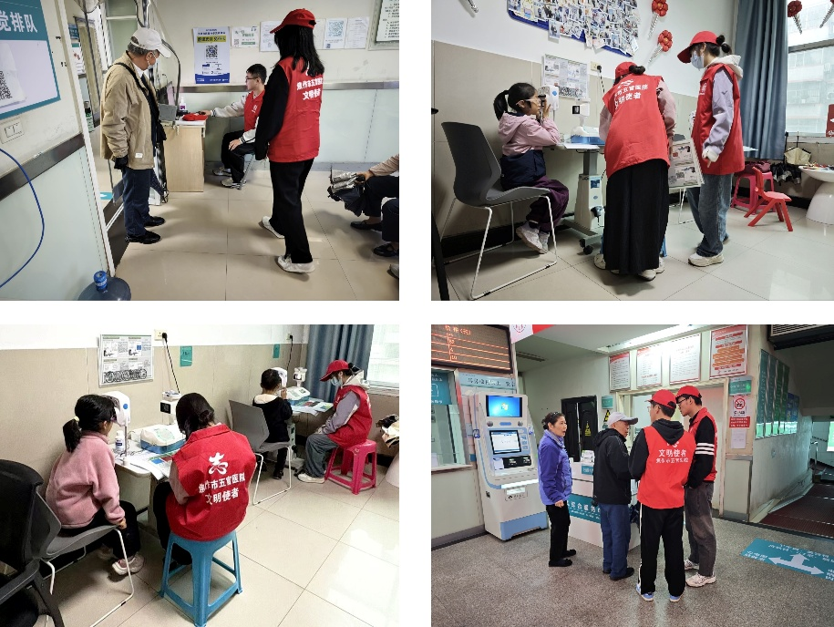 活动当天,志愿者们清晨集结,满怀热忱奔赴服务岗位。在医院一楼大厅,他们耐心为前来就诊的患者指引方向,详细解答问询;面对患者,他们主动协助填写就诊信息,用热情周到的服务化解了患者初来乍到的陌生与不便。在自助服务区,志愿者们格外关注老年群体的需求,细致地协助他们完成缴费、查询检验报告等操作,并耐心解答使用中遇到的各种问题,有效缩短了患者的等候时间。在视力检测区域,志愿者们不仅引导患者有序检查,还积极配合医护人员,协助进行滴眼药水等基础操作,并适时向市民科普日常护眼知识,传递健康理念。在耳喉鼻科诊区,他们积极协助患者完成挂号,为不熟悉环境的患者引路,并自觉维护公共秩序,有效减轻了医护人员的工作负担。
